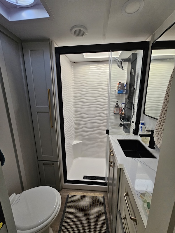 RV bathrooms aren’t exactly known for their size—but this one does everything we need it to. It’s actually a pretty decent size, with a nice shower that makes it feel a little less “RV” and a little more like home.