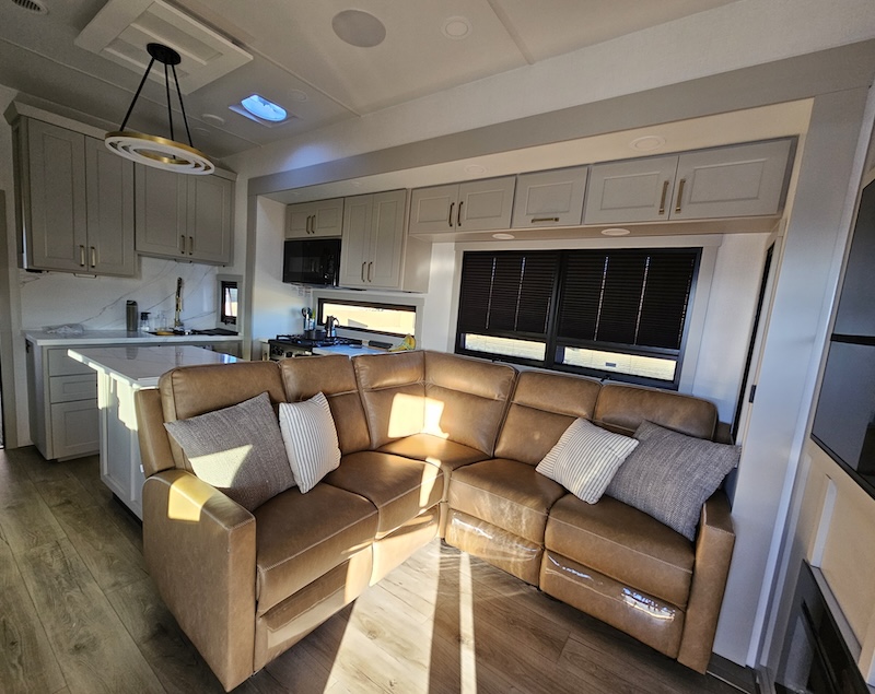 Before we dive into the tour, I want to share why we chose the Brinkley brand over all the other options out there. After hours of research and touring countless 5th wheels—opening every drawer, peeking into every cabinet, and sitting on all the furniture—we finally landed on the Brinkley 5th wheel toy hauler, G3950.