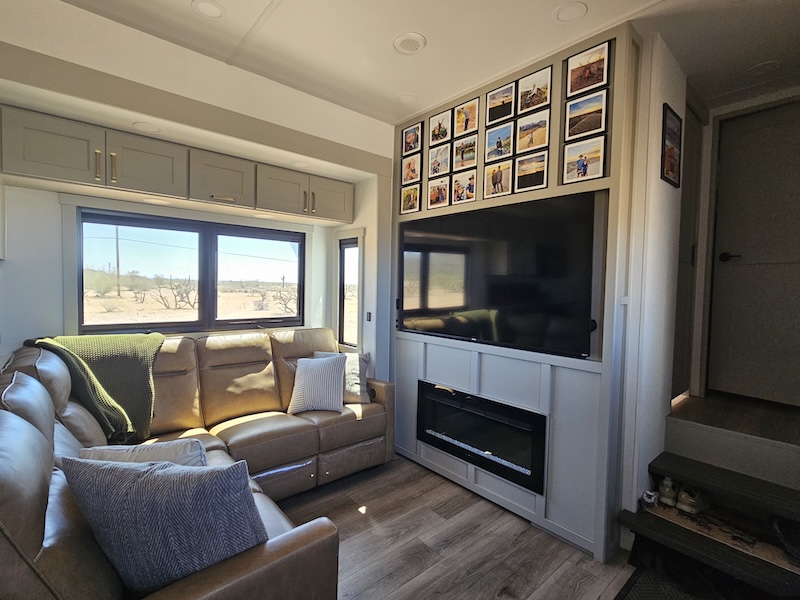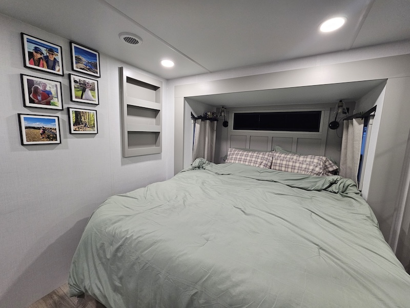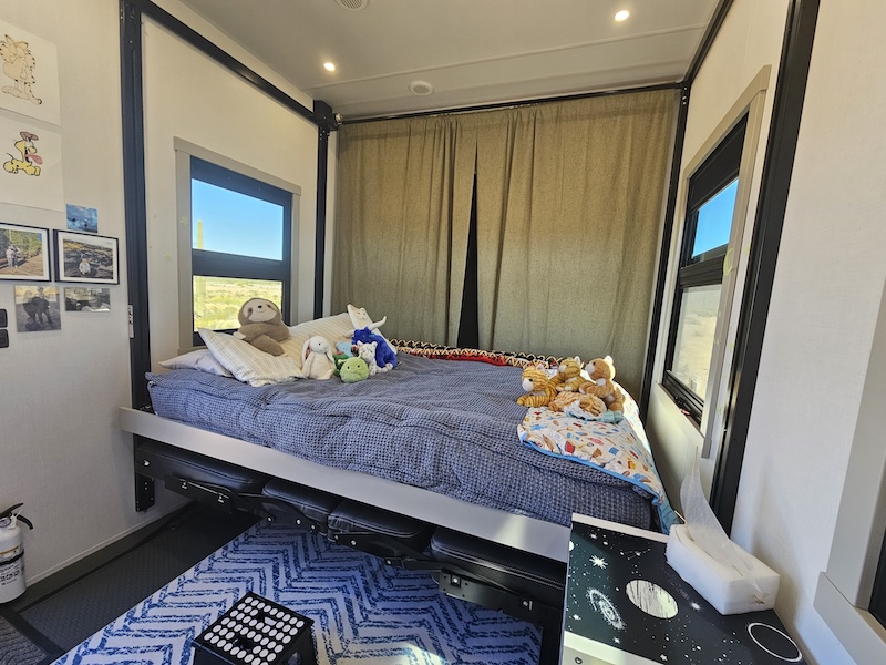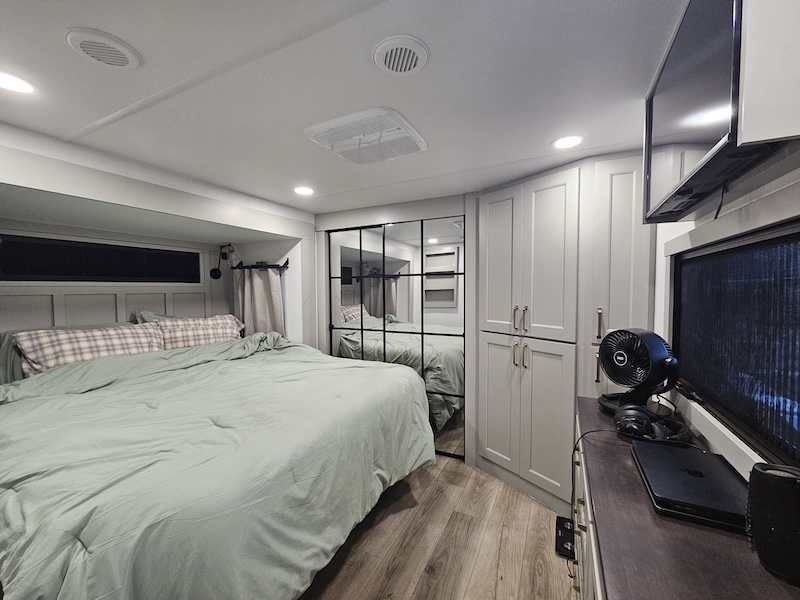 Another thing we’ve really come to appreciate is the amount of storage in our bedroom. There’s a huge closet, plenty of under-the-bed storage, and even prep for a washer and dryer—features that make everyday life on the road feel a little more comfortable and a lot more practical.