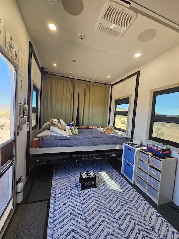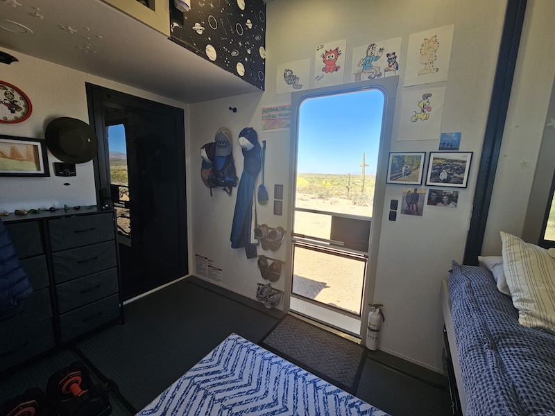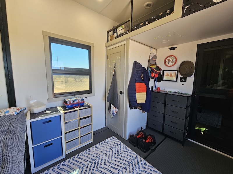 One of the things that makes this space work so well is that our bedroom doubles as Derek’s office. Brinkley had such a smart idea with the dresser—the top slides out to become a desk. Derek still wants to tweak a few things to make it more functional, but even now, it’s already way better than what we had in the Renegade. And honestly? Being able to close the bedroom door during meetings has been a total game-changer.