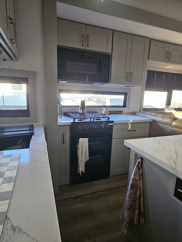 Our kitchen is actually fairly large for a fifth wheel, and it’s one of our favorite spaces. It has everything we need—and then some. From the oven to all the storage (including two pull-out pantry cabinets), it makes day-to-day life feel a lot easier. And the little extras? They honestly feel like luxuries. We have a pull-out spice rack, a pull-out cutting board, and even a pull-out garbage can (and if you’ve ever lived or traveled in an RV, you know how amazing that is). These are things we didn’t even have in our house, which still feels a little wild to say.