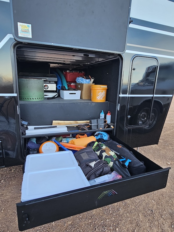 One of the things we love about our Brinkley is the outside storage—what we call the garage. The entire section beneath our bedroom acts as a huge storage area, giving us space for just about everything we need on the road.