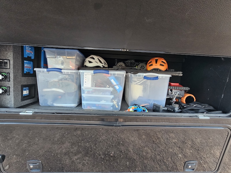 We haven’t quite nailed the perfect organization system yet, but we’re loving the two massive pull-out drawers on either side—they make accessing things so much easier. There’s plenty of room for all our gear, including our Blackstone grill, chairs, firepit and paddle boards.