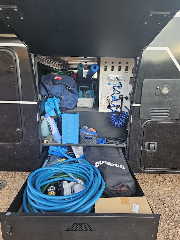 Like the rest of our RV, the garage is another space we plan to fine-tune as we settle in—finding better ways to organize and make it fully functional while still keeping it easy to use. For now, it’s working great and gives us all the extra storage we could ever need.